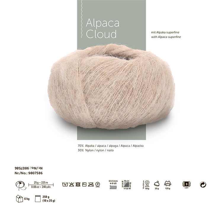 Мягкая и легкая как облако – это Альпака Клауд. Эта деликатная пряжа изготовлена из тончайших волокон шерсти альпака, скрепленных нейлоновой нитью. Вот почему эта пряжа действительно легкая. Альпака Клауд доступна в мягких пастельных оттенках, но также и в ярком сиянии блестящих тонов. Драгоценный блеск возможен за счет волокна альпака. В дополнение цветовой палитры разработаны глубокие тёмные тона. Все цвета легко сочетаются. Пряжа идеально подходит не только для шалей и шарфов, но и для легкой одежды. Альпака клауд можно вязать в одну или две нити, на маленьких и больших спицах.