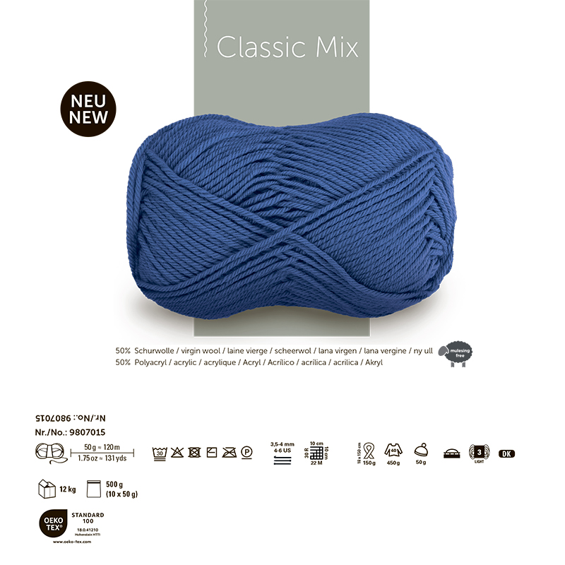 CLASSIC MIX — это пряжа от немецкого бренда Schachenmayr, известного своей высококачественной пряжей для вязания и рукоделия. Classic Mix — это классика, проверенная временем. Натуральная шерсть и акрил создают равномерный узор, удобную посадку,стабильность размеров и оптимальную простоту в уходе. Пряжа Classic Mix отличается красивой и ровной структурой стежка. Она средней толщины, что позволяет быстро создавать разнообразные модели для женщин, мужчин и детей. Изделия из этой пряжи можно стирать в режиме деликатная стирка не более 30°C. Сушить в горизонтальном виде в тени. Пряжа сохраняет свой вид и качество даже после многочисленных стирок. А доступная цена делает Classic Mix отличным выбором для всех. Для изделия размера M понадобится 500 грамм пряжи, а для шапочки — всего 50 грамм. Рекомендуемые спицы: номер 3,5-4 мм.