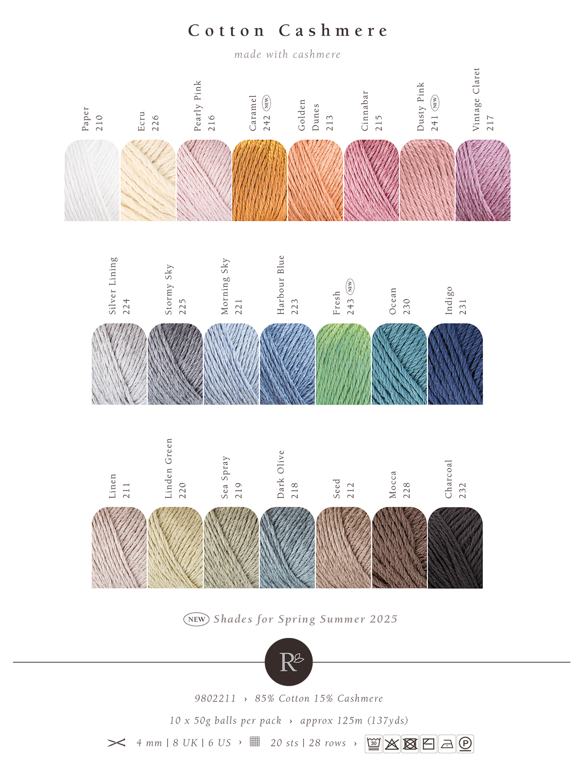 Rowan-британский премиальный бренд пряжи высокого качества с натуральными составами. Cotton Cashmere — изысканная мягкая пряжа из хлопка и кашемира. Изделия из этой удивительной пряжи можно носить в любое время года. Она подходит для женской,мужской и детской одежды. Представлена в 16 нежных оттенках с эффектом меланжа. Всесезонная пряжа с матовой бархатистой текстурой состоит из 85% хлопка и 15% кашемира. Она мягкая, как фланель, и комфортная в работе. Волокна хлопка и кашемира аккуратно скручены , что позволяет создавать ровные петли при вязании. Полотно из этой пряжи стабильно и хорошо держит рисунок. Эта пряжа идеально подходит для детей и людей с чувствительной кожей. Уход: деликатная стирка при температуре не выше 30 градусов, сушить в расправленном виде в тени.Перед началом проекта обязательно свяжите и постирайте образец. Для изделия размера M потребуется 400–500 грамм пряжи.Рекомендуемые спицы: 6 мм.