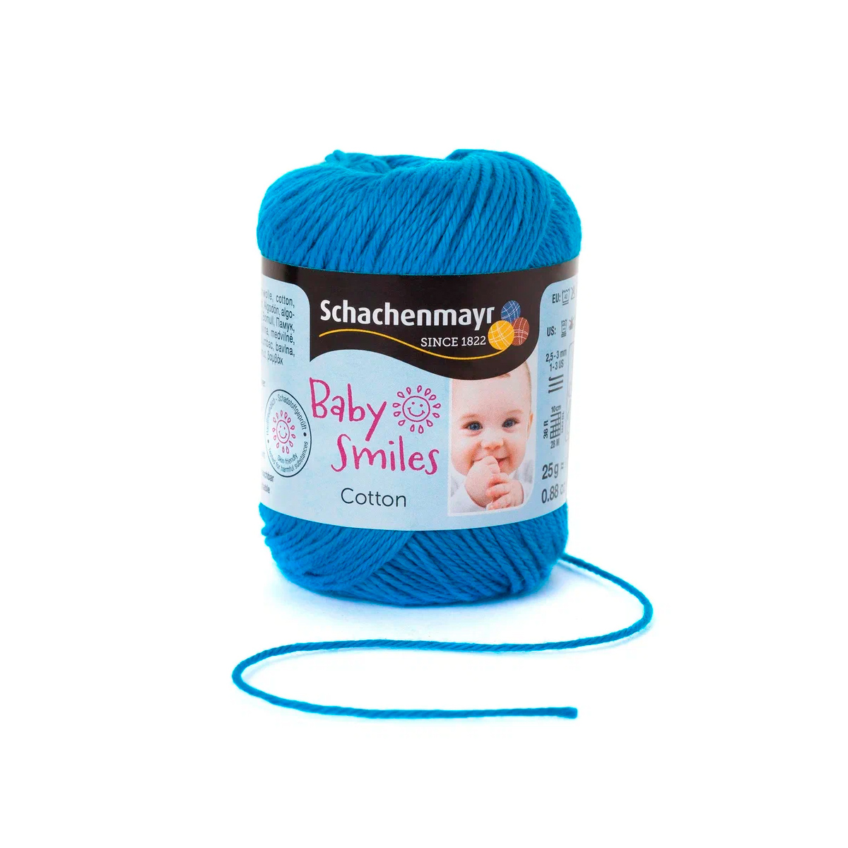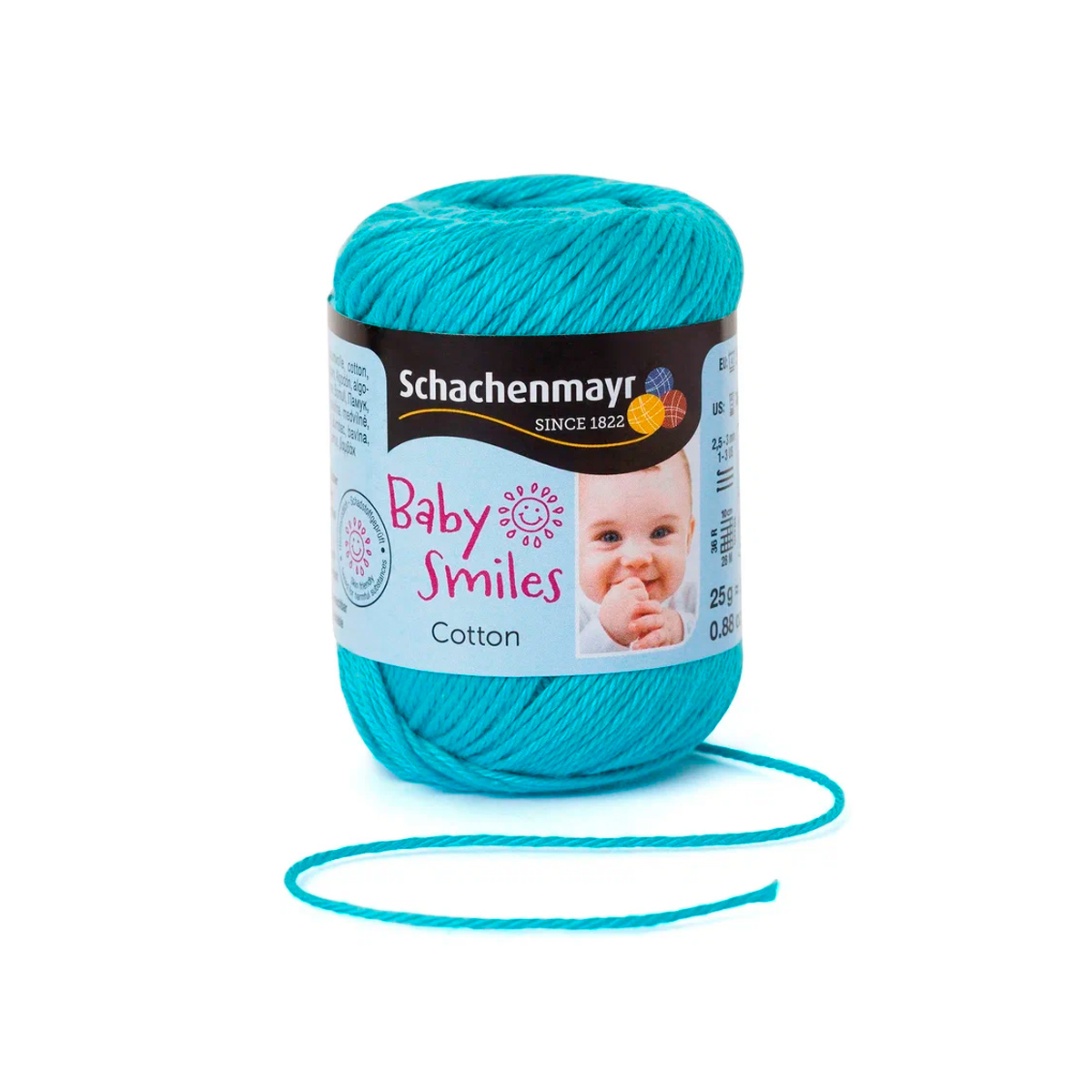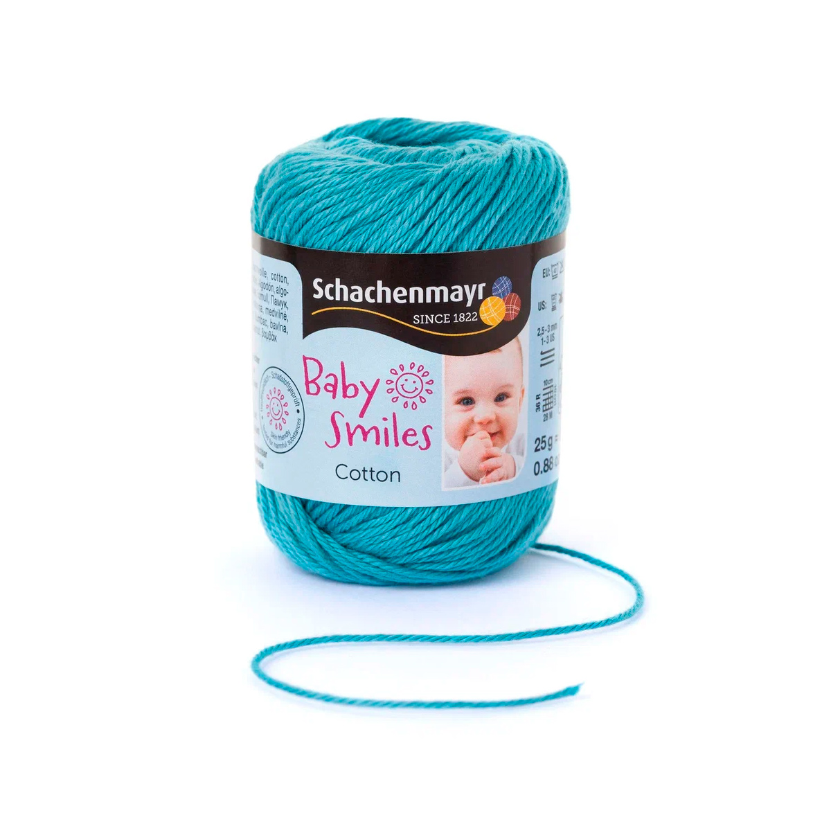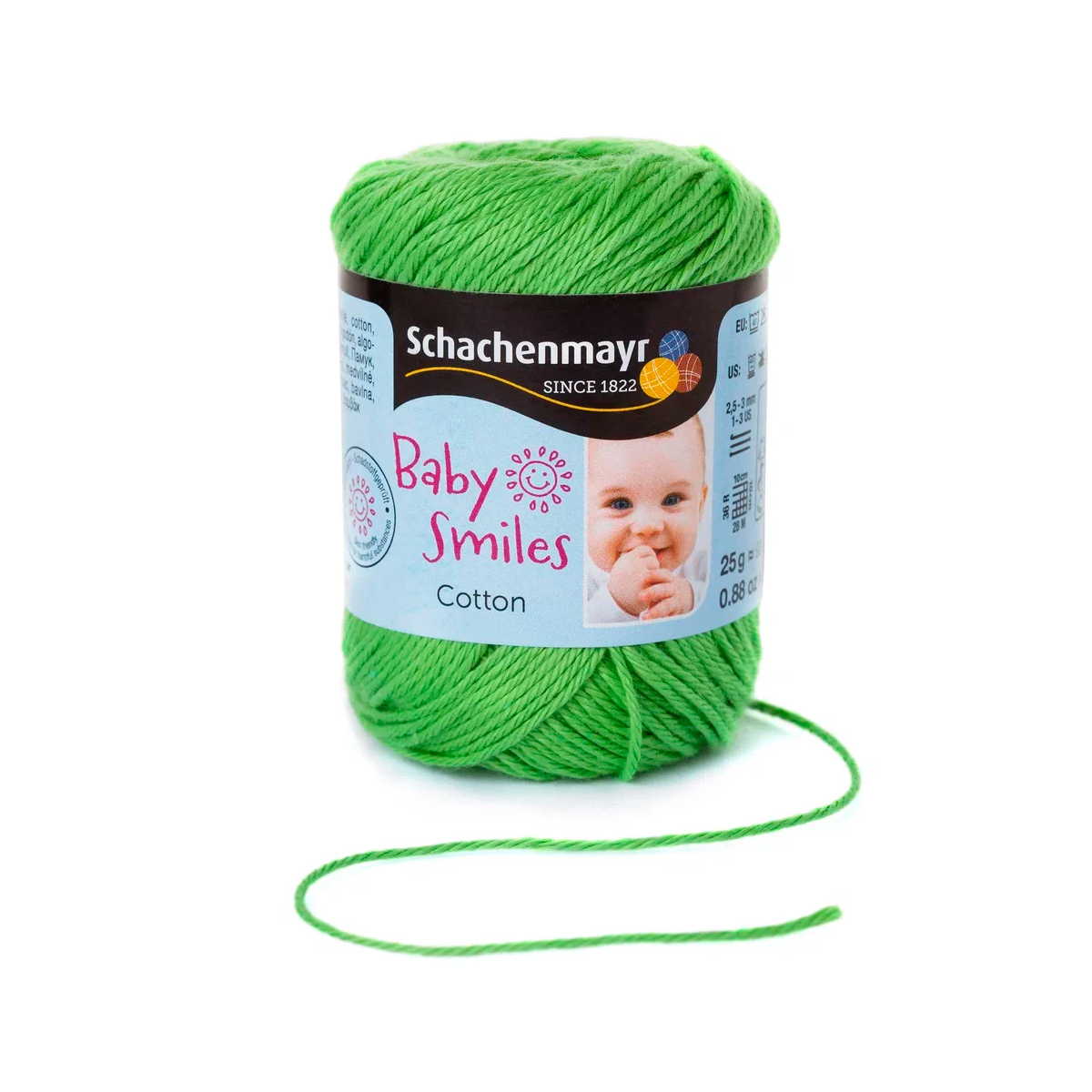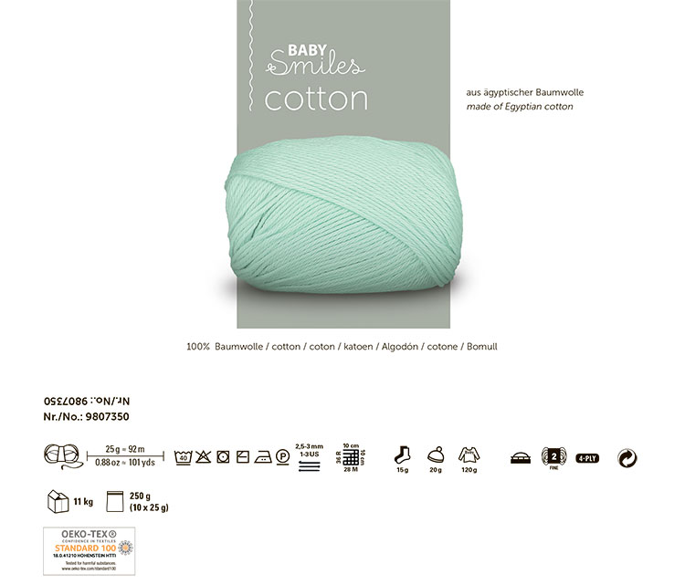 Baby Smiles Cotton (Котон) - высококачественная, легкая в уходе хлопчатобумажная пряжа в красивых ярких цветах. Длинные волокна египетского хлопка делают ее очень прочной, мягкой и приятной на ощупь. Стоимость объясняется использованием натуральных красителей для окрашивания нитей, именно поэтому ребенок может смело брать в рот и вещи и игрушки связанные из этой нити.