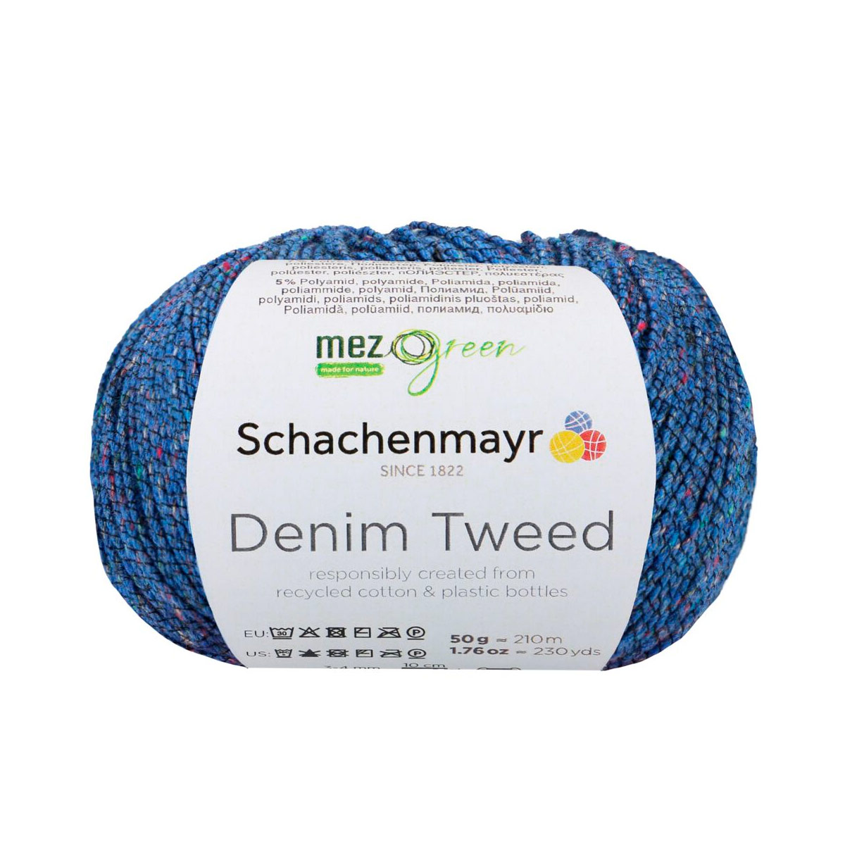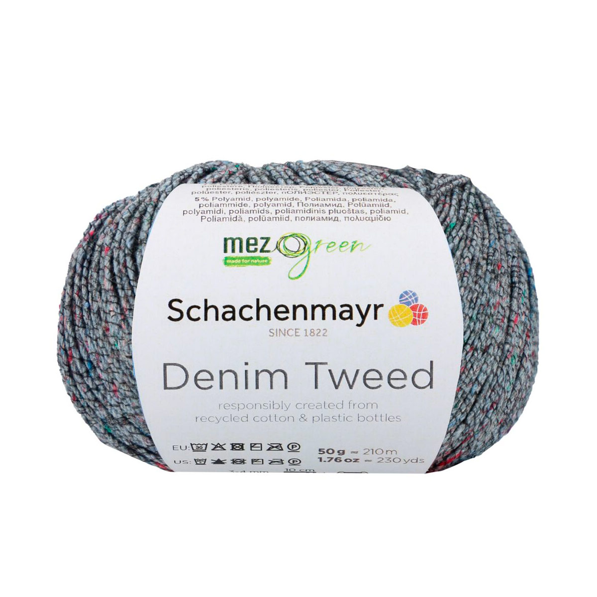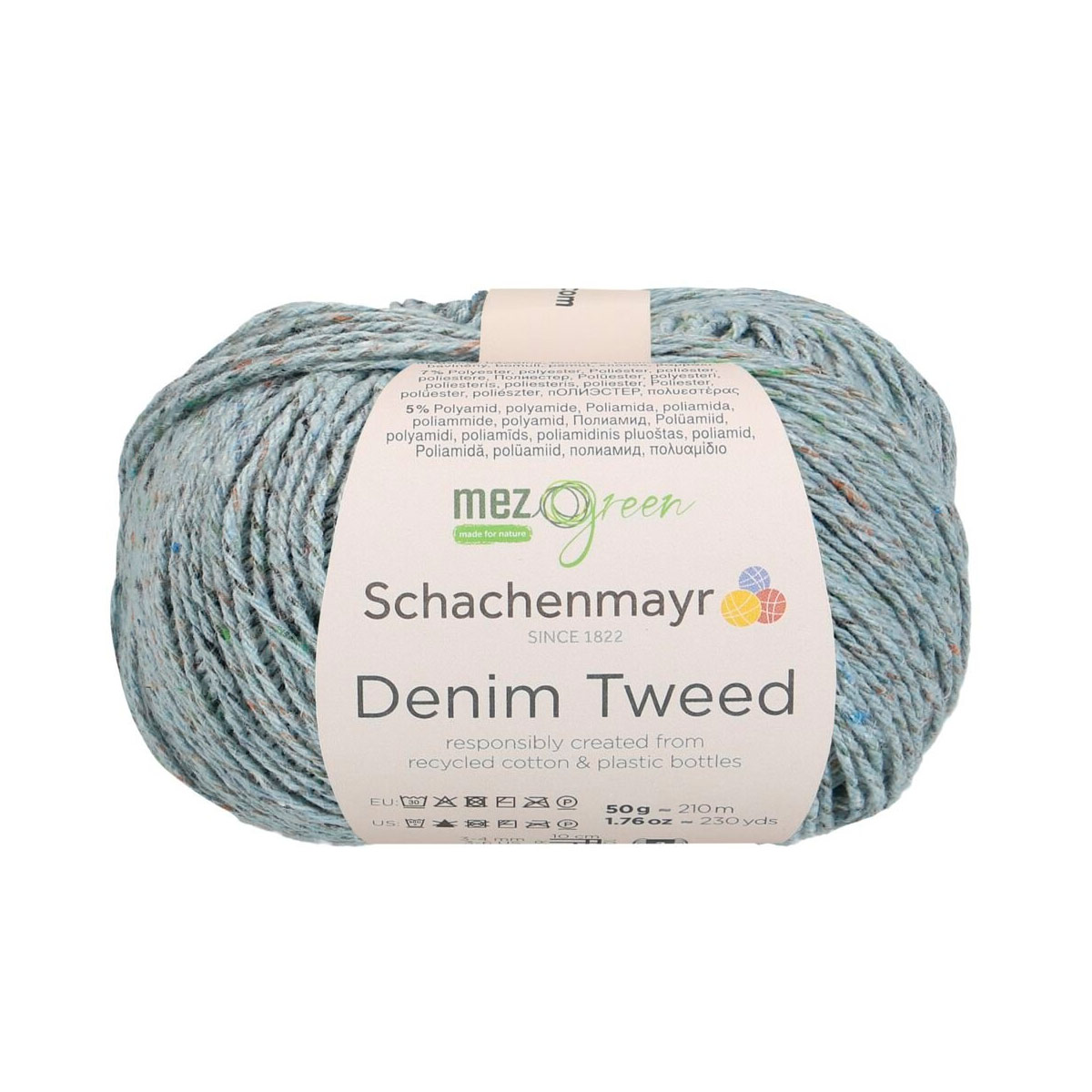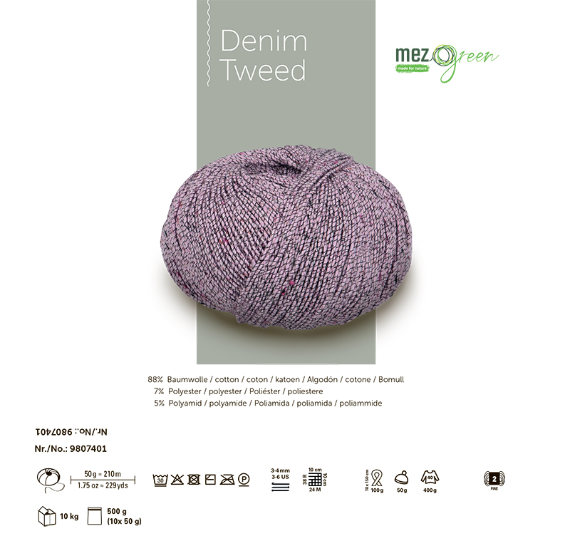 DENIM TWEED — это пряжа от немецкого бренда Schachenmayr, известного своей высококачественной пряжей для вязания и рукоделия. Деним — это идеальный материал для повседневной одежды и создания уникальных вещей. Вязание из него приносит особое удовольствие. Denim Tweed из линейки MEZ Green сделан из переработанных материалов. Хлопок получают из текстильных отходов, а полиэстер — из переработанных ПЭТ-бутылок. В результате получается пряжа с небольшими цветными комочками, напоминающими классический твид. Для прочности и визуального эффекта её скручивают с тонкой полиамидной нитью. Хотя работа с тонкой пряжей требует терпения, результат того стоит. Эти модели станут вашими верными спутниками летом, так как они приятно охлаждают кожу. Denim Tweed не только лёгкий, но и экономичный: для женского свитера размера M нужно всего 400 граммов. Используйте спицы №3–4 мм. Деликатная стирка при 30 С, сшить горизонтально в полутени.