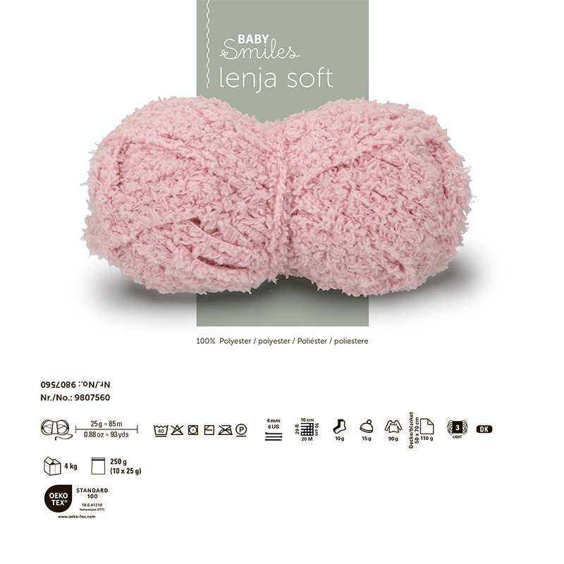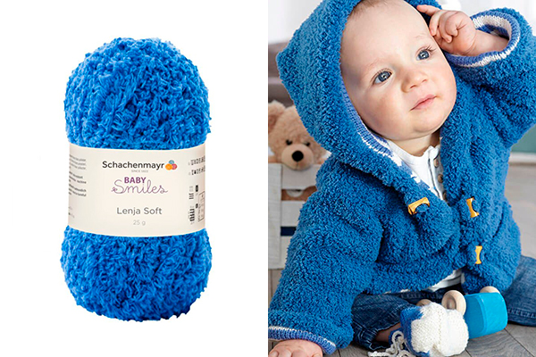 LENJA SOFT-это пряжа от немецкого бренда Schachenmayr, известного своей высококачественной пряжей для вязания и рукоделия. Пряжа Lenja Soft -самая нежная в коллекции,пушистый,плюшевый эффект напоминает мягкую шерсть и обволакивает кожу ребенка,как облачко.Отлично сохраняет тепло и идеально подходит для создания уютных курточек, шапок и игрушек.Пряжа безопасна для детской кожи, не содержит вредных веществ и не осыпается,даже если попадает в рот малыша. Изготовленная из полиэстера,Lenja Soft отличается высокой износостойкостью.Чтобы ворс не отделялся от трикотажного полотна, пряжа текстурирована: с одной стороны ворсинки застревают в структуре,а с другой-образуют пушистый слой.Это удобно для начинающих вязальщиц,ошибки и неровности остаются незаметными благодаря ворсу.Кроме одеял и подушек Lenja Soft прекрасно подходит для создания плюшевых игрушек.Можно стирать и сушить в машинке, что делает эту пряжу идеальной для детских вещей и игр.На кофточку для младенца понадобится всего 90 грамм.Рекомендуемые спицы 4мм.
