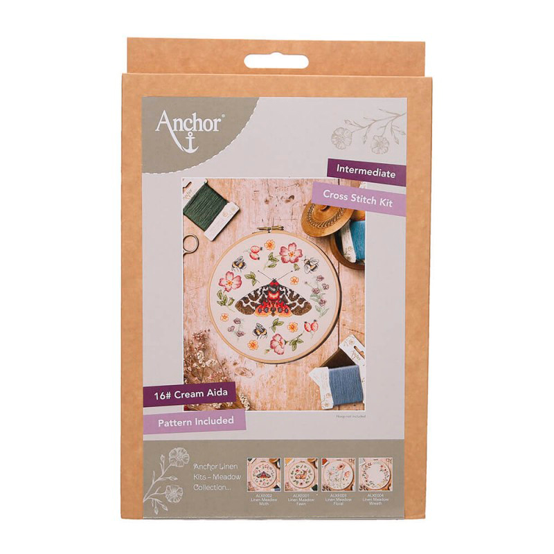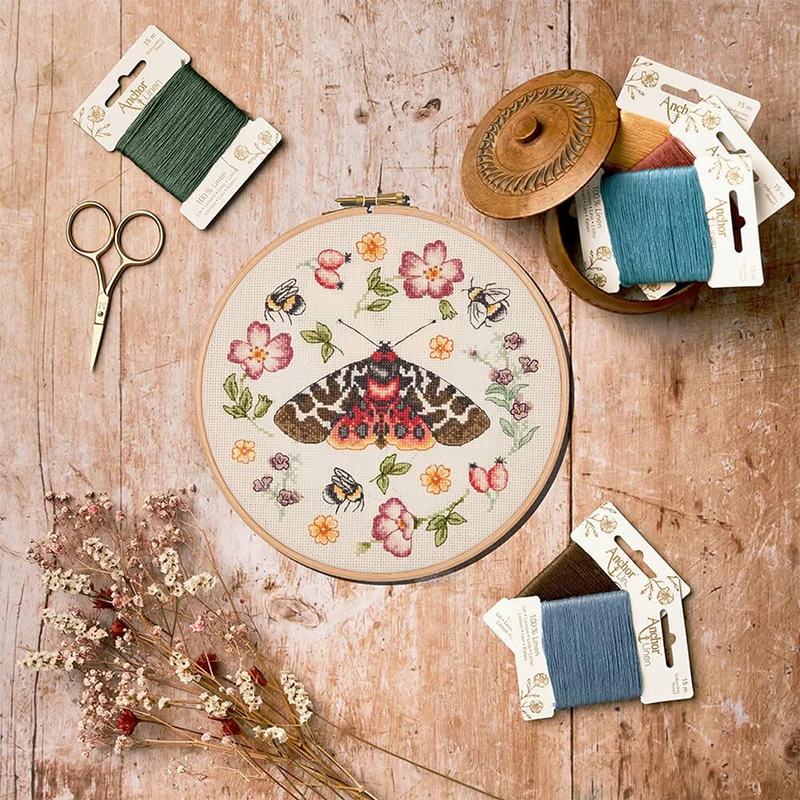Набор для вышивания Anchor "Meadow Moth" /Луг Мотылек/ диаметр 20см (состав: канва Aida 16 цвет бежевый, схема черно-белая, нитки Anchor 100% лен, игла, инструкция), счетный крест, уровень сложности 2
